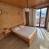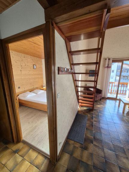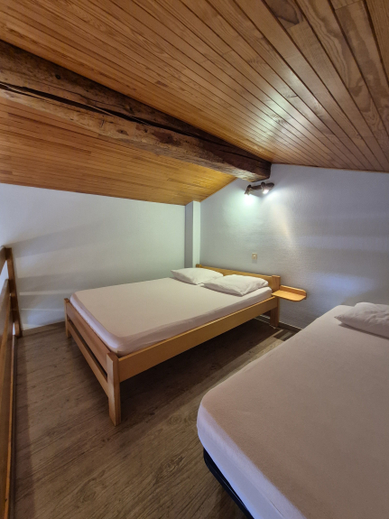 Ein Schlafzimmer mit Balkon und einem Doppelbett, Zwischengeschoss mit einem Doppelbett und einem Einzelbett.