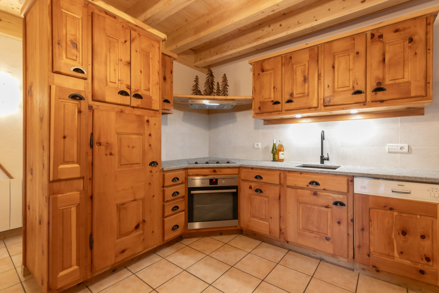 Die Küche ist mit einem Cerankochfeld, einem Geschirrspüler, einem Elektroofen, einer Mikrowelle und einer Dunstabzugshaube ausgestattet.