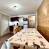 - Eine zum Wohnzimmer offene Küche mit 4 Elektroherden, zwei kleinen Kühlschränken, Mikrowelle und Geschirrspüler.