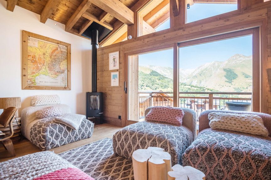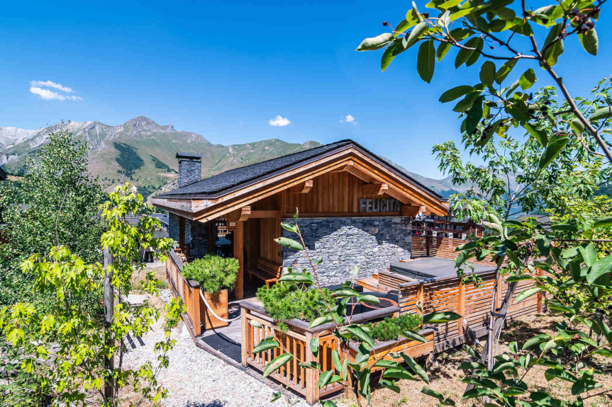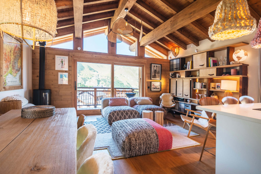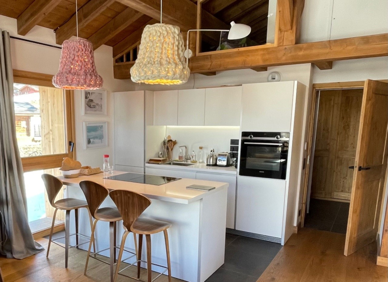 Komfort und moderner Luxus in den Bergen: der Holzofen, eine hochmoderne integrierte Küche... und die Terrasse mit Whirlpool und Feuerstelle.