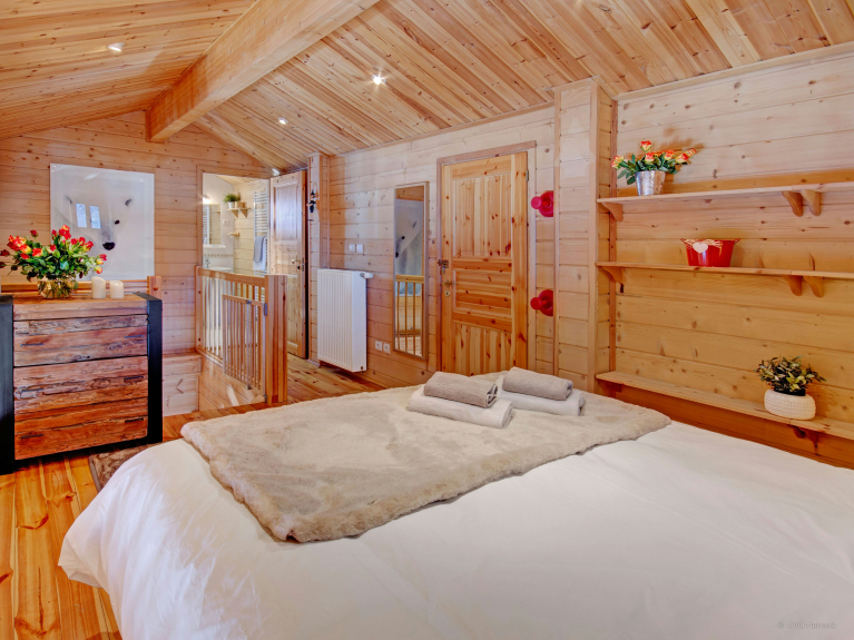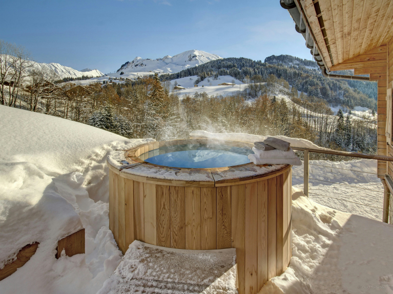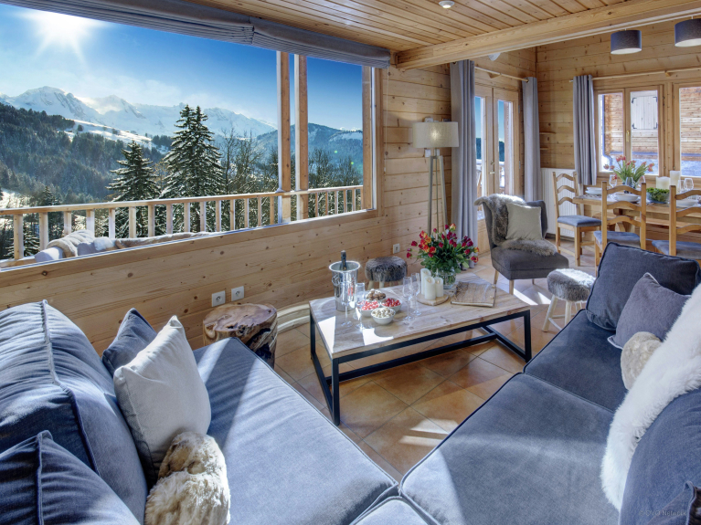 Der Wohnbereich öffnet sich zu einem möblierten Balkon und einer Terrasse, ideal für ein Frühstück in der Sonne oder für eine heiße Schokolade oder einen Wein auf dem Weg zurück zum Chalet. Der gemütliche Wohnbereich ist ein großartiger Ort, um sich abends auf den Sofas zu treffen und die Aktivitäten des Tages zu besprechen, während man die fantastische Aussicht aus dem großen Erkerfenster bewundert. Oder möchten Sie sich lieber im nordischen Freibad entspannen, um nach einem anstrengenden Tag abzuschalten?