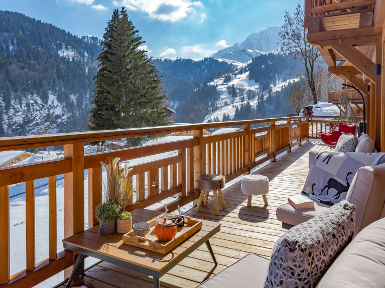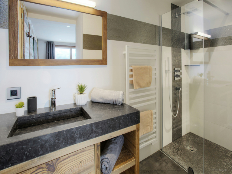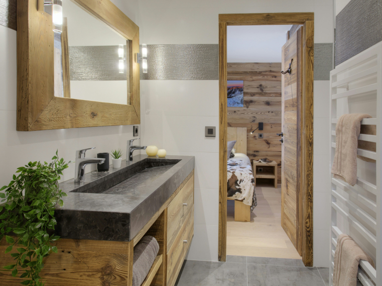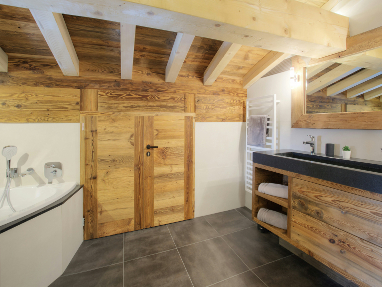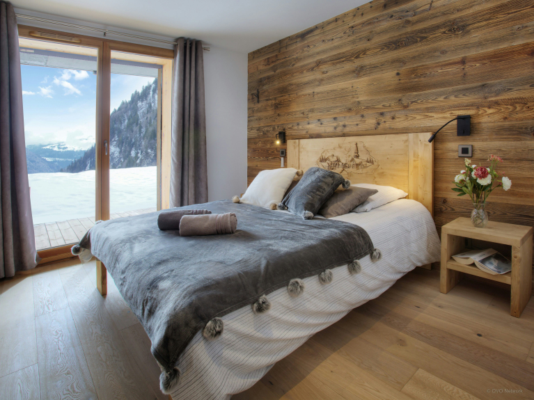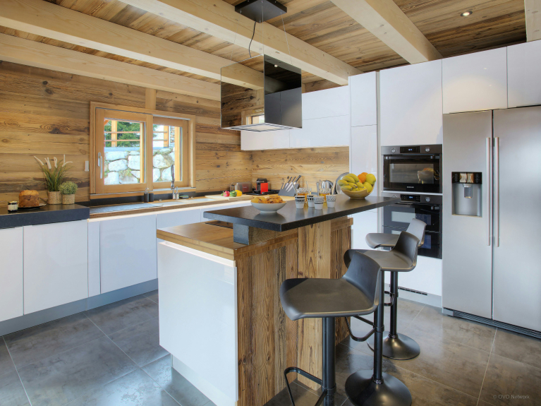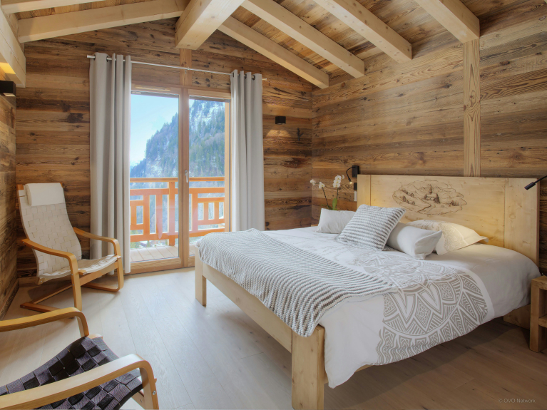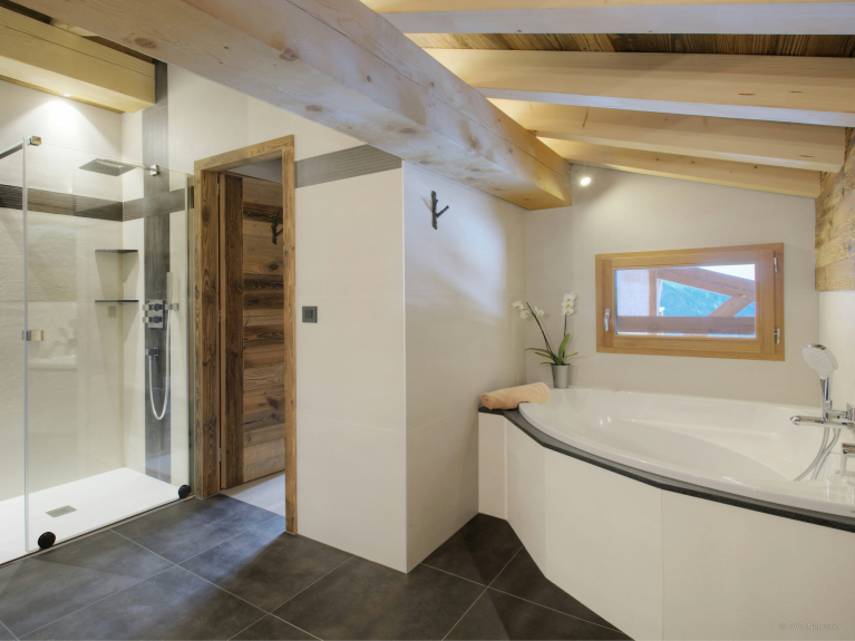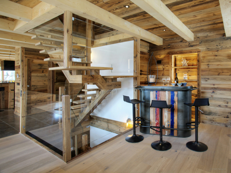 Die Wohnfläche verteilt sich auf drei Ebenen. Der Eingang befindet sich auf der ersten Ebene. Sie haben Zugang zur großen Doppelgarage, die sehr geräumig ist, um Fahrräder und Skier abzustellen, sowie zum Skiraum mit beheiztem Schuhregal. Auf der ersten Ebene befindet sich auch ein großes Wohnzimmer mit Ess- und Küchenbereich. Große Fenster und Türen führen auf den großen, gut belichteten Balkon, der sich über eine Seite und den Giebel des Chalets erstreckt. In der modernen, gut ausgestatteten Küche gibt es genug zu essen für alle. Ein großer amerikanischer Kühlschrank sorgt für kühle Getränke, eine Bar für das Frühstück, und der Tisch ist groß genug für gemeinsame Mahlzeiten. Und nach dem Abendessen können Sie sich auf den bequemen Sofas entspannen und einen Film ansehen oder einen Schlummertrunk an der Bar nehmen. 4 von 5 Zimmern befinden sich auf der Gartenebene und haben Zugang zu einer Terrasse. Ob im Sommer oder im Winter, öffnen Sie frühmorgens die Türen, um die frische Bergluft hereinzulassen - ein guter Start in den Tag! Drei der Schlafzimmer sind Doppelzimmer und das vierte ist ein Kinderzimmer, ausgestattet mit Etagenbetten, einem Einzelbett und einem eigenen Duschbad. Das fünfte Schlafzimmer ist eine geräumige Suite auf der obersten Ebene. Dieser luxuriöse Raum verfügt nicht nur über ein sehr großes eigenes Bad, sondern auch über ein Ankleidezimmer und einen Balkon mit spektakulärer Aussicht. Die drei Etagen sind durch eine sehr elegante Treppe aus Holz und Glas verbunden, die viel Licht durchlässt.