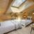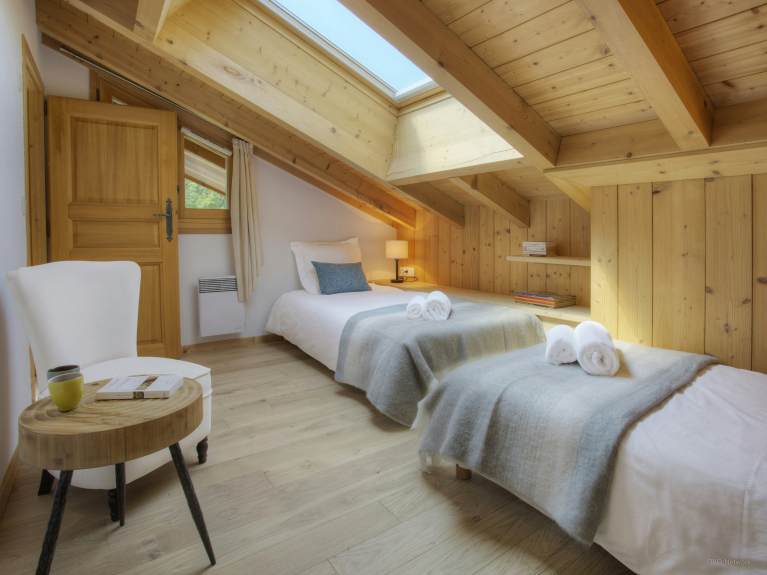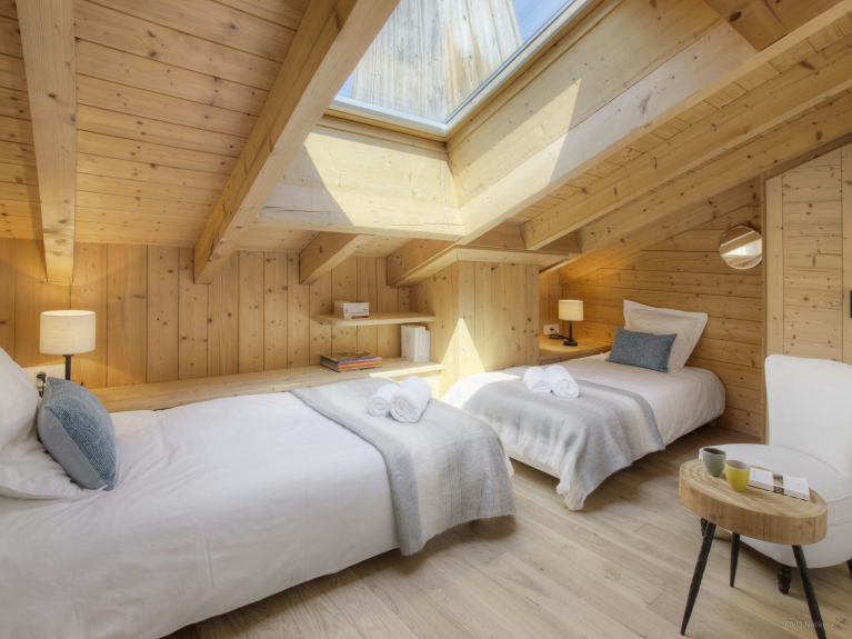 Die Wohnung hat drei Schlafzimmer: ein Doppelzimmer mit Velux-Fenster und eigenem Duschbad, ein Zweibettzimmer mit Blick auf die Berge und ein Einzelzimmer mit Blick auf die Hügel. Ein zweiter Duschraum und eine separate Toilette sind vorhanden.