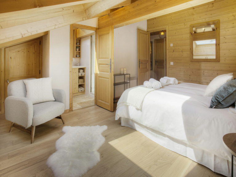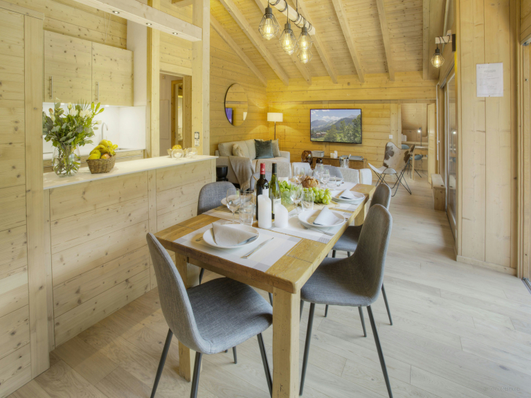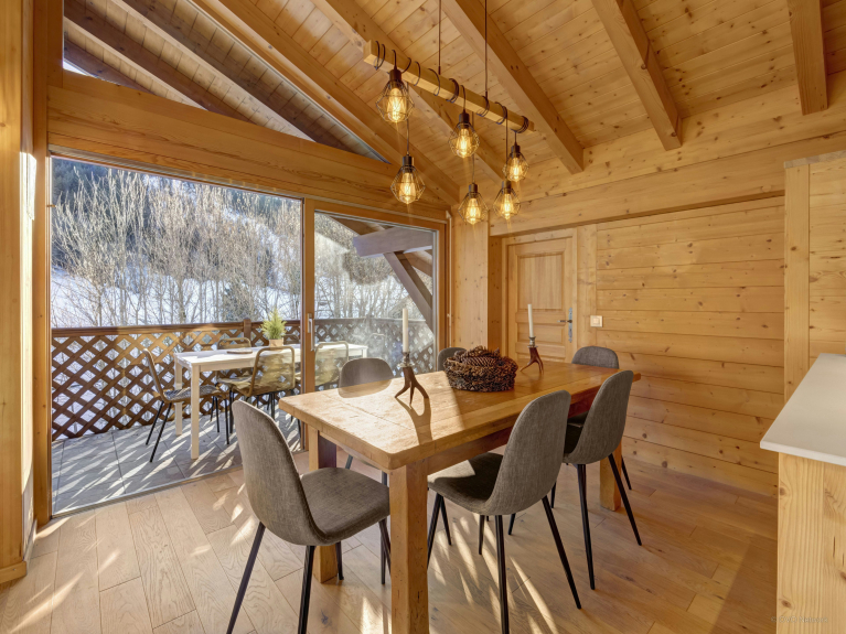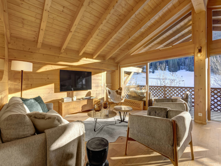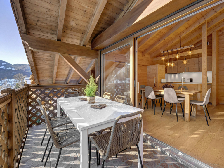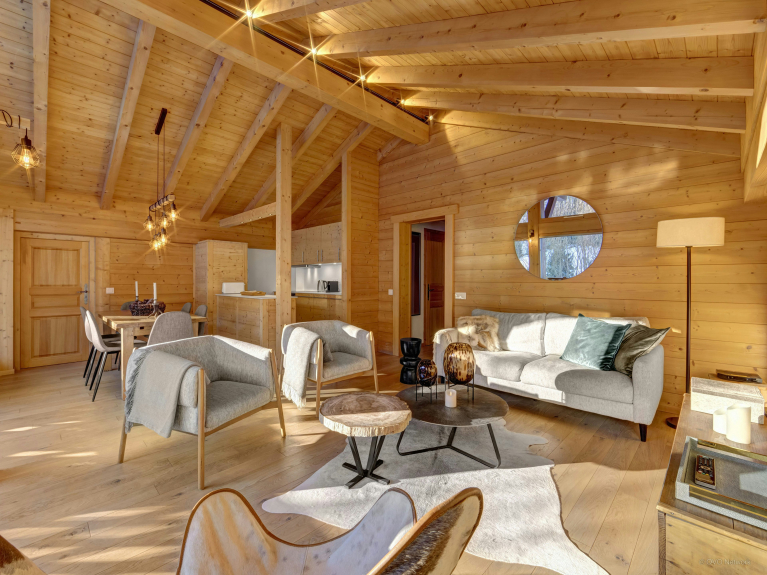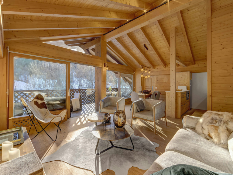 Die Wohnung nimmt ein ganzes Stockwerk des Chalets ein, in dem sich vier weitere Wohnungen befinden. Der Wohnbereich ist völlig offen und besonders geräumig, da er sich über die gesamte Breite der Wohnung erstreckt und auf einen nach Süden ausgerichteten, sonnigen Balkon führt. Es ist ein wunderbarer Ort, um sich zu entspannen, den Morgenkaffee zu genießen oder den herrlichen Sonnenuntergang über dem Aravis-Massiv bei einem Glas Wein zu beobachten.