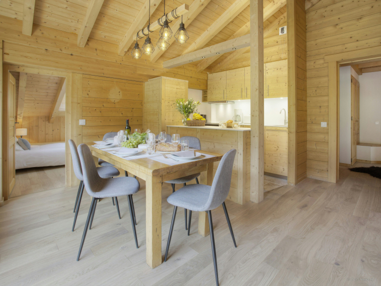 Diese helle Wohnung in ruhiger Lage verfügt über drei Schlafzimmer und zwei Duschbäder und kann bis zu fünf Personen beherbergen. Es kann daher bis zu fünf Personen beherbergen. Die jüngsten Renovierungsarbeiten haben zu einer neuen Küche und neuen Duschräumen geführt. Die Wohnung wurde ebenfalls in neutralen Tönen und mit modernen Möbeln renoviert, um den traditionellen alpinen Stil zu unterstreichen.