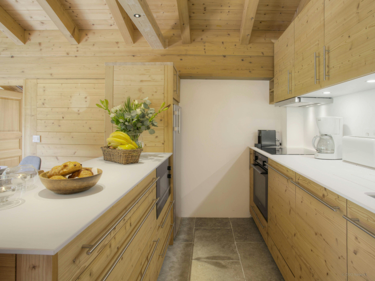 In der kleinen Küche, die durch eine Bar vom Essbereich getrennt ist, finden Sie alles, was Sie brauchen, um eine köstliche Mahlzeit zuzubereiten, bevor Sie auf die Piste gehen. Der Kühlschrank ist groß und es gibt auch einen Geschirrspüler, der Ihnen das Leben sicher erleichtert.