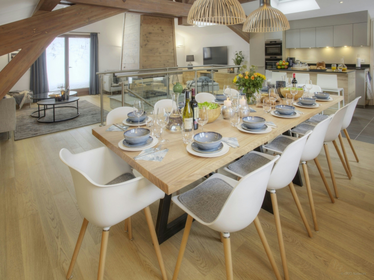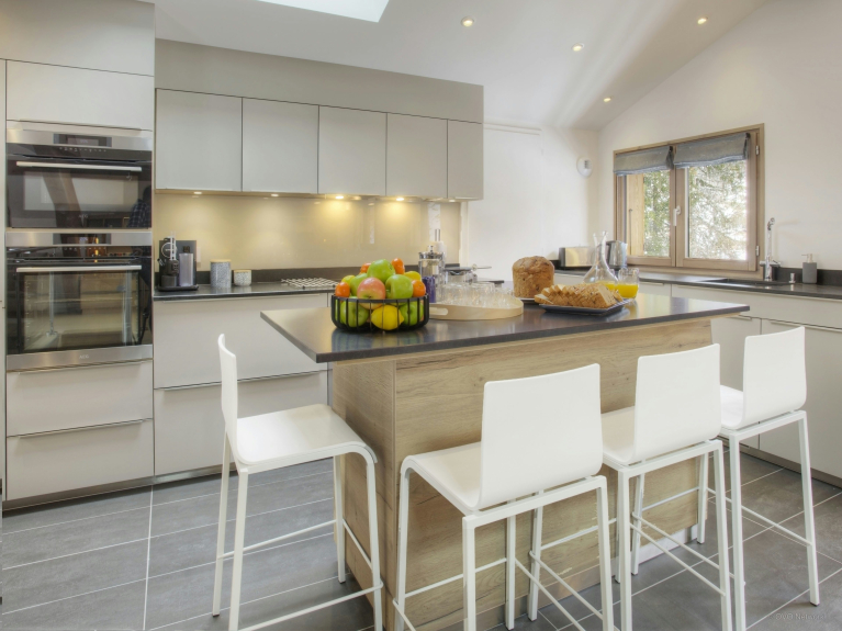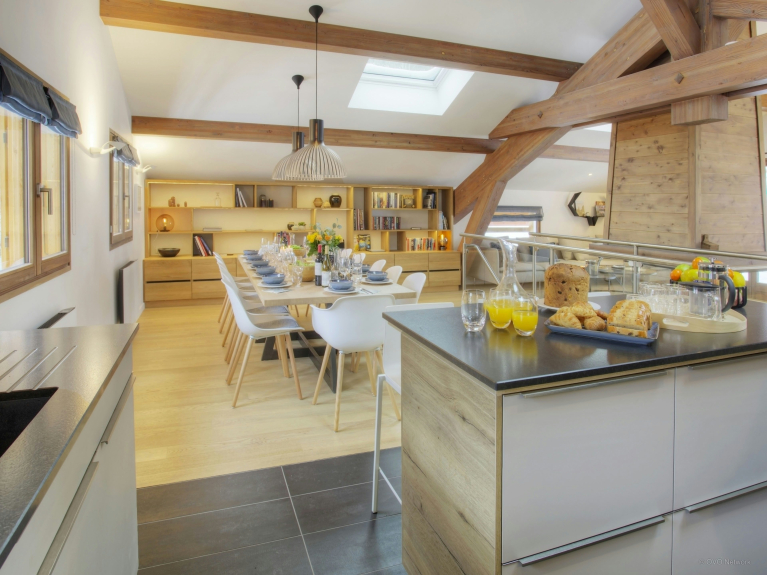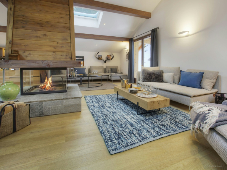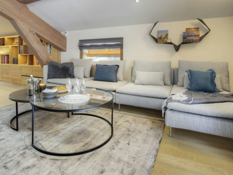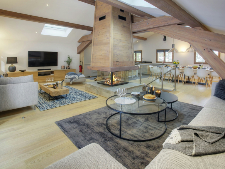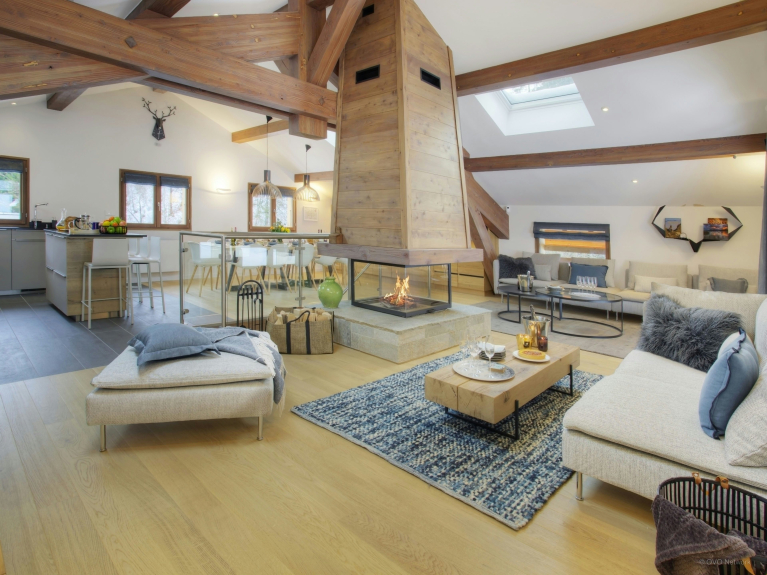 Gehen Sie dann die Treppe hinauf in die Mitte des Wohnbereichs. Auf der einen Seite befindet sich die voll ausgestattete Küche mit Bar, großem Tisch und Regalen. Auf der anderen Seite sind bequeme Sofas, Sessel und Couchtische um einen zentralen Kamin und einen Fernseher angeordnet. Sie werden es lieben, in diesem Raum einen Film zu sehen, den Tag Revue passieren zu lassen oder Ihr nächstes Bergabenteuer zu planen. Eine Treppe führt zur Terrasse und zum Garten auf der Rückseite des Chalets, wo Sie den Sonnenuntergang beobachten und vielleicht sogar grillen können.