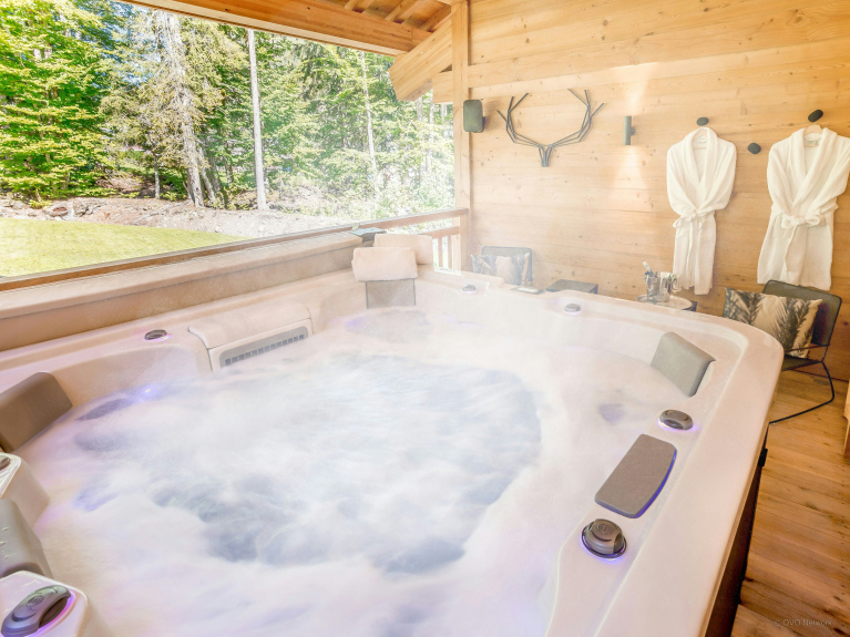 Auf dieser Ebene befindet sich auch der Wellnessbereich mit einer Sauna mit Dusche und einer überdachten Terrasse mit Whirlpool. Entspannen Sie sich, während Sie den Skifahrern beim Slalomfahren durch die Bäume zusehen.