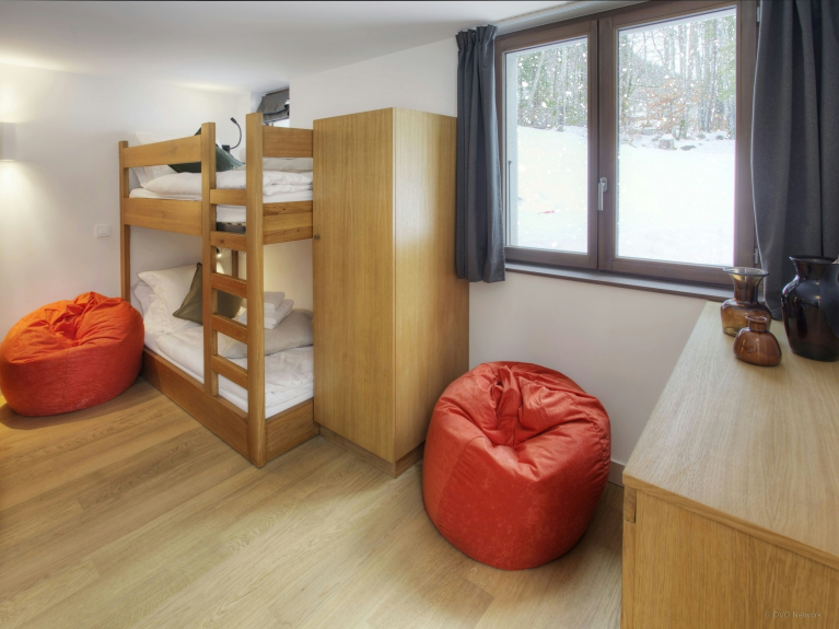 Sie betreten das Haus über das Erdgeschoss. In den beheizten Schließfächern in der Eingangshalle finden Sie genügend Platz für Ihre Ausrüstung, Skier und Schuhe. Die Waschküche befindet sich ebenso auf dieser Ebene wie zwei Schlafzimmer, die sich ein Duschbad teilen. Das eine hat zwei Einzelbetten, das andere, für vier Personen, hat Etagenbetten und eine X-Box.
