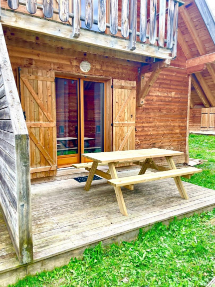 Das Chalet verfügt über eine Terrasse mit Blick auf die Berge, einen Tisch im Freien, Liegestühle, einen Skiraum und einen Parkplatz vor dem Eingang.