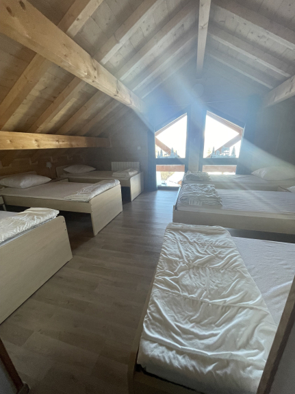 In der obersten Etage befindet sich der Schlafsaal für 6 Personen mit einem Badezimmer mit Badewanne und separatem WC.