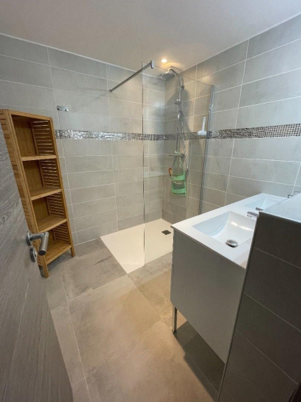 Das Erdgeschoss besteht aus einem Wellnessbereich mit Hammam und Sauna, einem Wohnzimmer mit TV-Ecke, einem Schlafzimmer mit Doppelbett und Einbauschrank, einem Badezimmer und einer separaten Toilette.