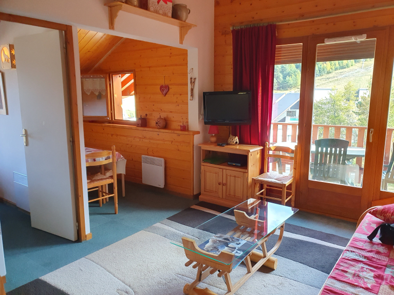 Das Wohnzimmer lädt Sie ein, eine heiße Schokolade auf der Terrasse mit Blick auf die Pisten und den SÜDEN zu genießen.