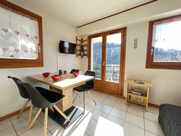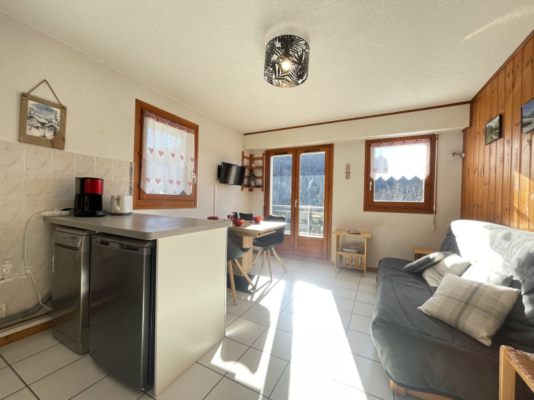 Ruhig gelegene Wohnung im authentischen Dorf Notre Dame de Bellecombe. Fläche von 35m², ideal für vier Personen. Sie befindet sich im Erdgeschoss der Residenz mit einem Südbalkon, der eine schöne Aussicht auf den Mont Charvin und das Tal bietet. Sie liegt nur wenige Schritte von der Freizeitanlage, neben der Skibushaltestelle und weniger als 5 Minuten zu Fuß von den Geschäften und Restaurants entfernt.