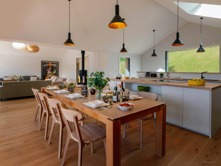 Das Anwesen ist prunkvoll und funktional zugleich. Es verfügt über 3 Doppelzimmer (davon 2 Suiten), einen bemerkenswerten Schlafsaal für die Kinder mit Büchern, Spielen, Fernseher und Tischfußball, ein gemütliches Wohnzimmer mit Holzofen, eine schöne Terrasse und einen Außenpool.