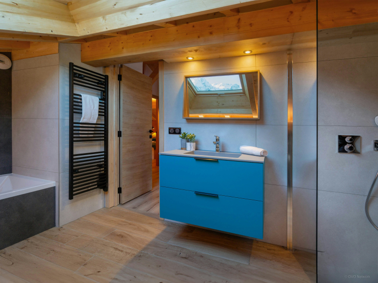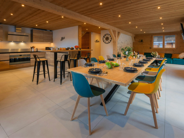 Der große offene Wohnbereich ist der ideale Ort, um am Ende des Tages abzuschalten. Mehrere Fenstertüren sorgen für viel Tageslicht und führen auf eine Panoramaterrasse, auf der Sie die Alpenluft genießen können. Ein riesiges Sofa steht einem Fernseher gegenüber, und vom Esstisch aus können Sie die Aussicht genießen.