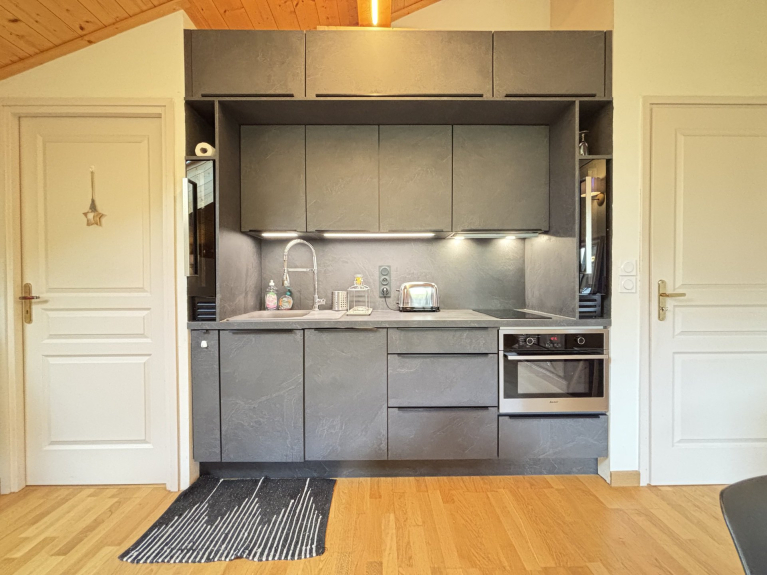 - Ein geräumiges und helles Wohnzimmer mit offener Küche, ausgestattet mit: Geschirrspüler, Kombi-Mikrowellenherd, Induktionskochplatten, Kühlschrank, zwei kleinen Weinkellern.