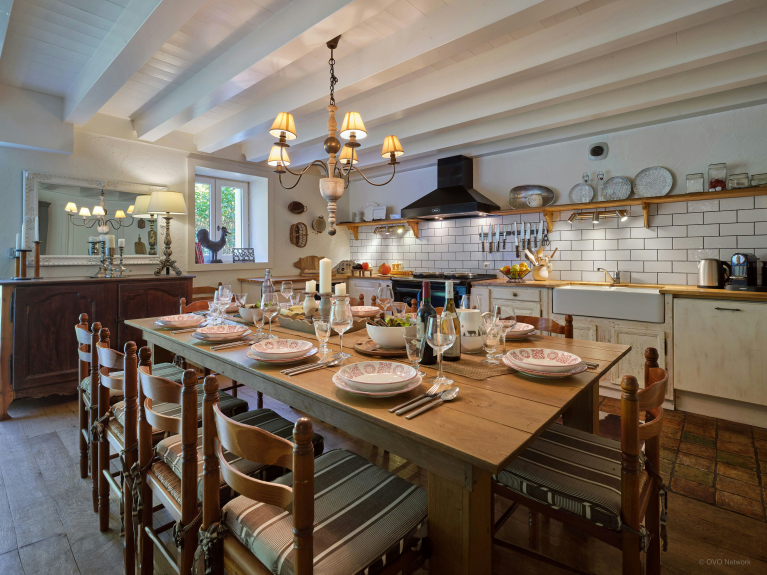 Im Erdgeschoss befindet sich der Wohnbereich mit einer großen, voll ausgestatteten Küche und einem großen Esstisch, an dem die ganze Familie zusammenkommen kann. Ein Kamin trennt das Wohnzimmer ab, das in drei gemütliche Bereiche unterteilt ist, in denen Sie fernsehen, eine Partie Schach spielen oder sich einen Moment des Lesens gönnen können.