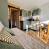 - Eine zum Wohnzimmer hin offene Einbauküche (Kühlschrank, Induktionskochfeld mit zwei Kochstellen, Dunstabzugshaube, Geschirrspüler und Mikrowelle mit Kombiofen).