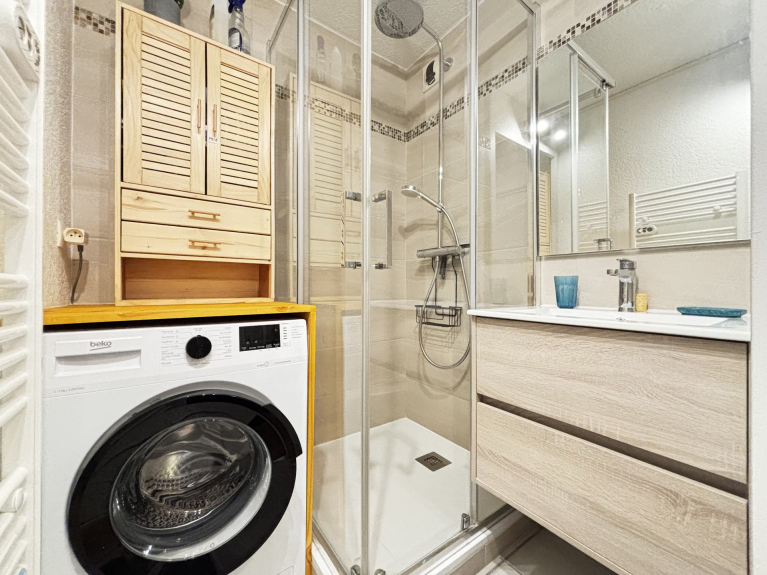 - Ein Badezimmer mit Dusche und Waschmaschine.