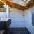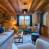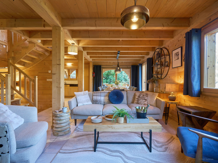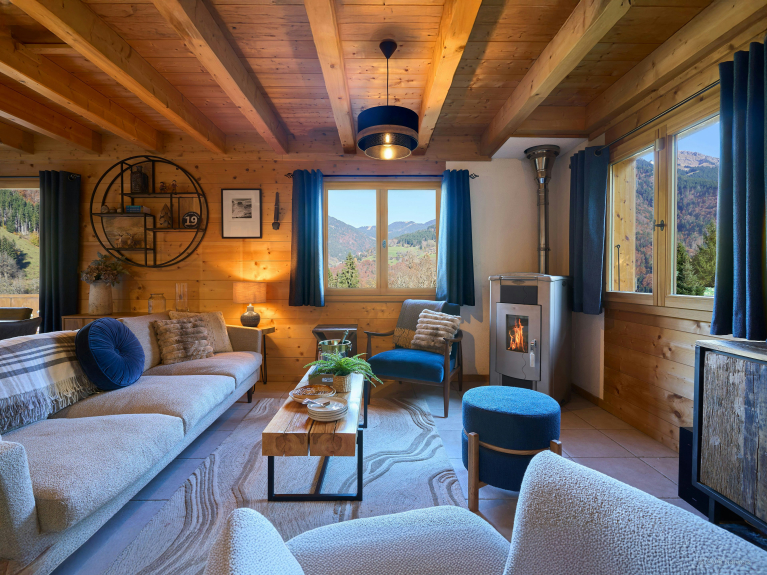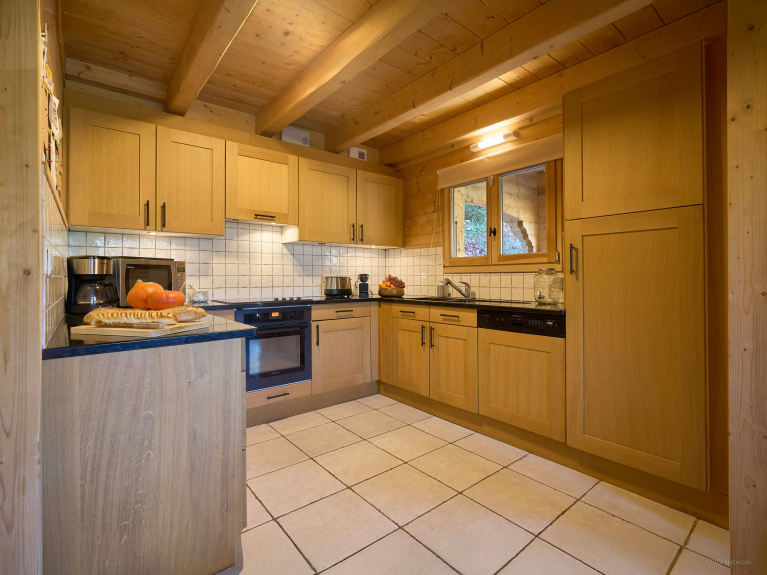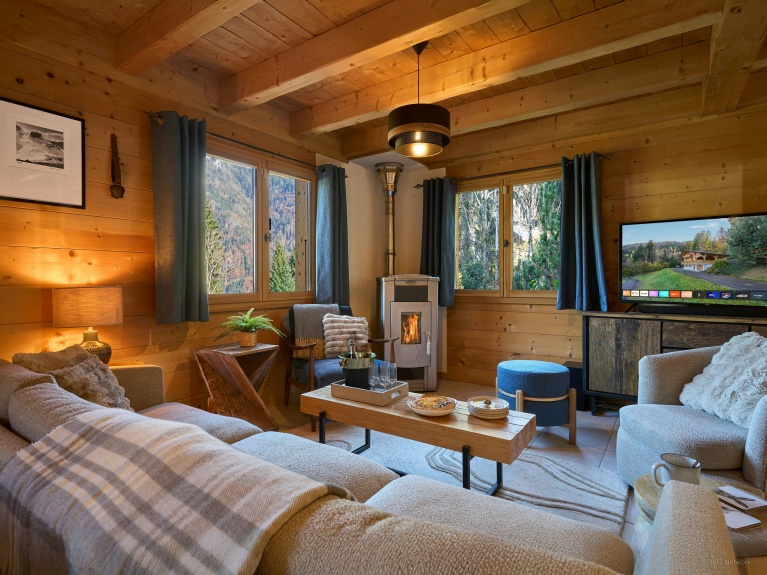 Der offene Wohnbereich genießt das Panorama dank der drei Fenstertüren, die auf eine möblierte Panoramaterrasse führen. Er verfügt über ein großes Wohnzimmer mit Fernseher und Holzofen sowie einen gemütlichen Leseraum. Die kompakte Küche ist mit allen notwendigen Geräten ausgestattet, darunter ein Geschirrspüler.