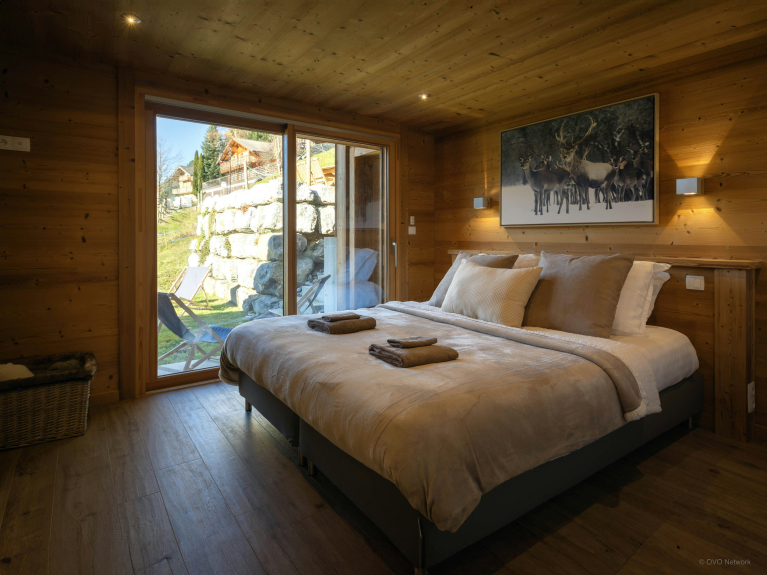 Die vier Schlafzimmer des Chalet Wanderlust sind im Erdgeschoss zusammengefasst. Es handelt sich um drei Doppelzimmer, von denen eines ein zusätzliches Einzelbett enthält, eines ein Duschbad und Zugang zum Garten bietet und das letzte über drei Einzelbetten verfügt. Diese Etage verfügt außerdem über ein Badezimmer mit Dusche, eine separate Toilette und eine Waschküche mit Waschmaschine und Trockner.