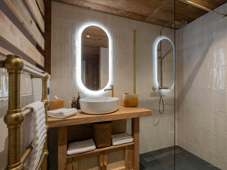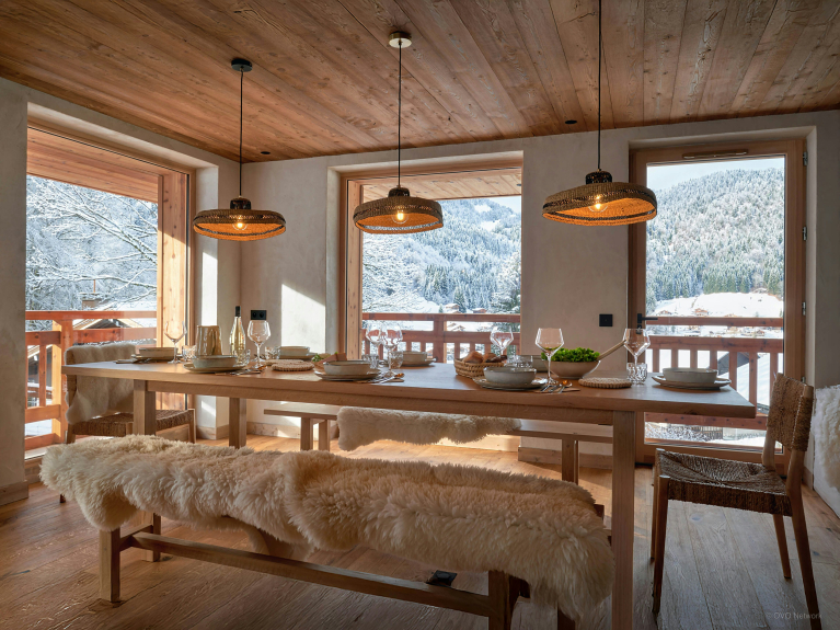 Der Wohnbereich im ersten Stock ist dank der großen Fensterfronten von natürlichem Licht durchflutet und führt auf eine Panoramaterrasse. Er besteht aus einer modernen, funktionalen Küche, einem Esstisch und einem Wohnzimmer mit einem Holzofen. Das Holzdekor und die neutralen Farbtöne im gesamten Chalet machen es besonders erholsam.