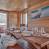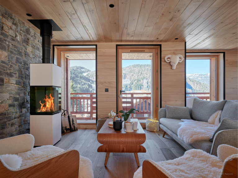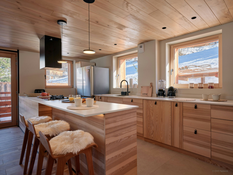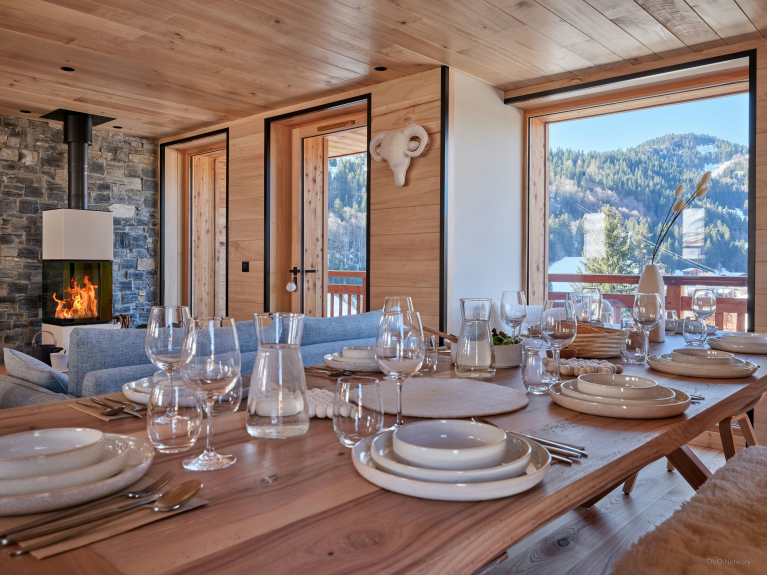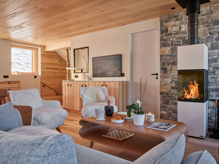 Der Wohnbereich im ersten Stock führt auf eine Panoramaterrasse. Er kombiniert eine moderne, funktionale Küche, einen Esstisch für 10 Personen und ein Wohnzimmer mit einem Holzofen und einem Fernseher. Eine große, sehr gesellige Theke lädt zum Kaffeetrinken ein.