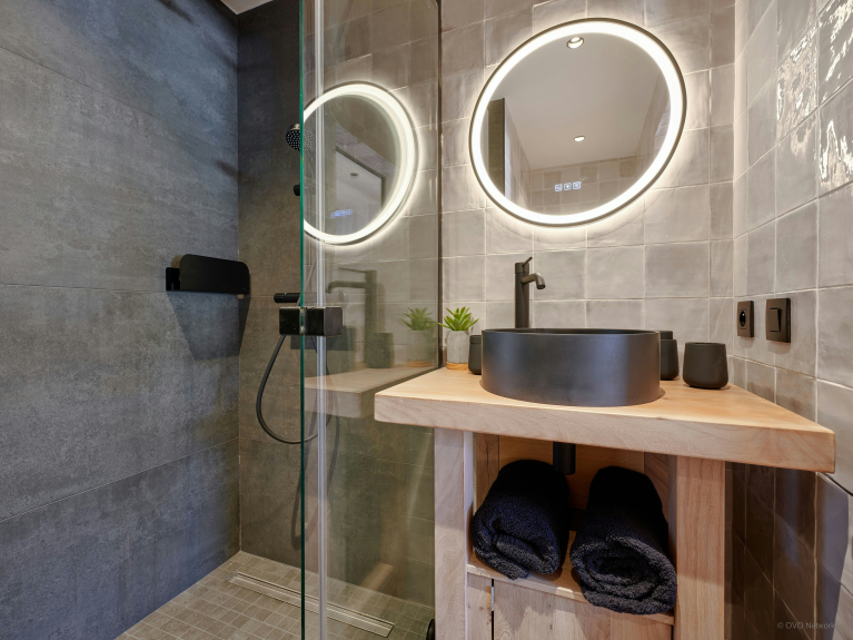 Auf der unteren Ebene befindet sich eine große Garage für bis zu sechs Autos mit zwei Ladestationen für Elektroautos, ein Skiraum und ein Fahrradunterstand.