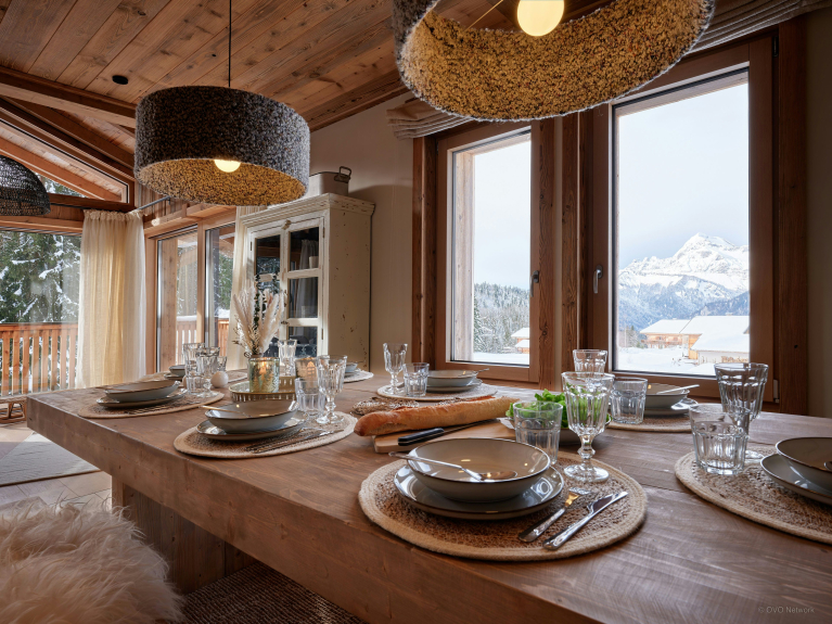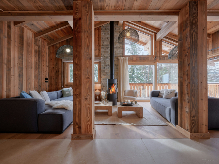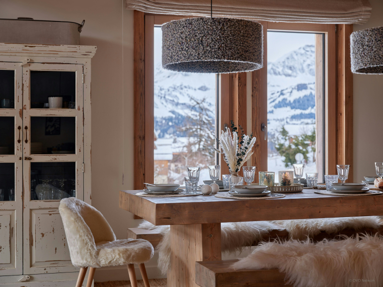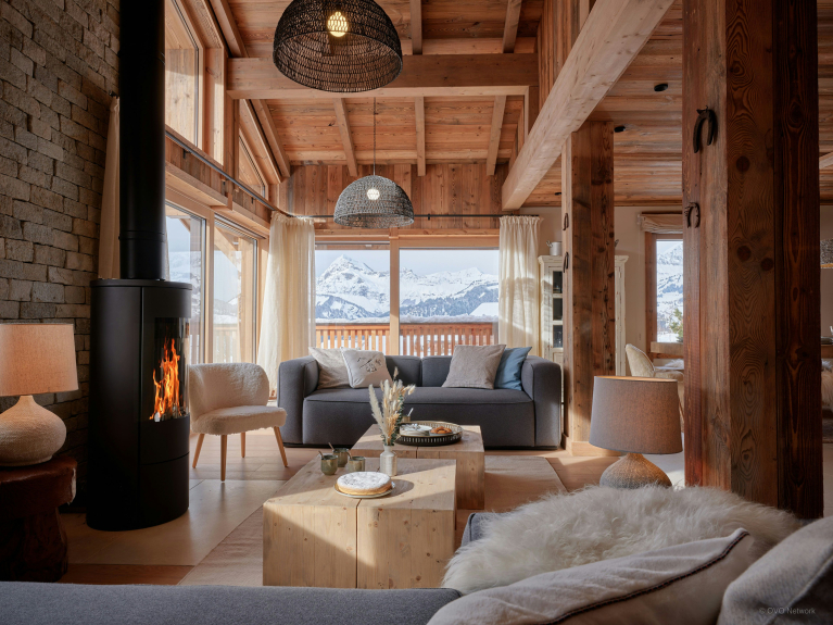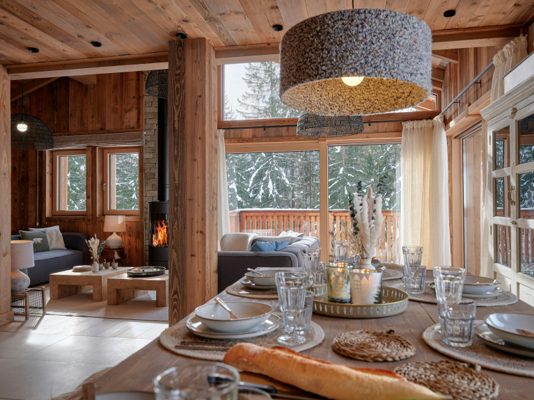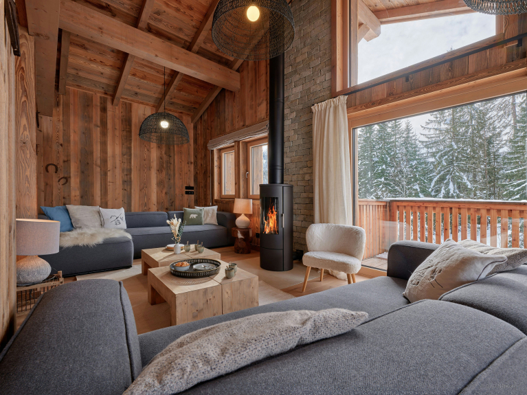Der im ersten Stock eingerichtete Wohnraum ist dank hoher Fenster und Terrassentüren, die auf einen entzückenden Eckbalkon führen, lichtdurchflutet. Von hier aus ist der Blick auf den Mont Charvin und die Aravis absolut sensationell. Auf zwei geräumigen Sofas können Sie sich um den Holzofen versammeln und sich die Erlebnisse des Tages erzählen. Einen Fernseher werden Sie hier nicht finden, denn das Chalet Marmot'Inn setzt auf Geselligkeit.