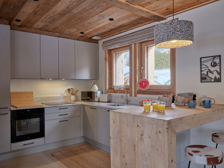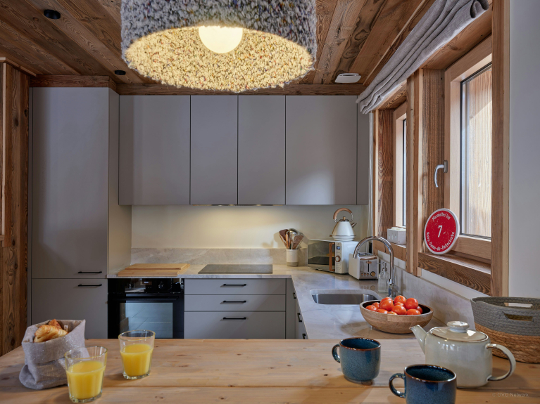 Am großen Esstisch aus Massivholz können alle gemeinsam essen, während die Theke, die das Wohnzimmer von der Küche trennt, ideal für den Morgenkaffee ist. Diese Küche ist mit allen notwendigen Utensilien ausgestattet, die von höchster Qualität sind.