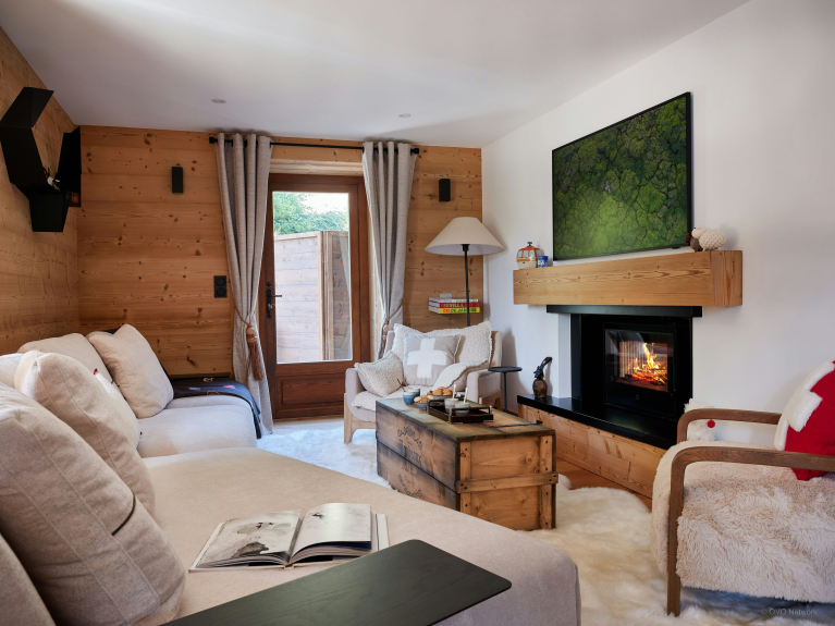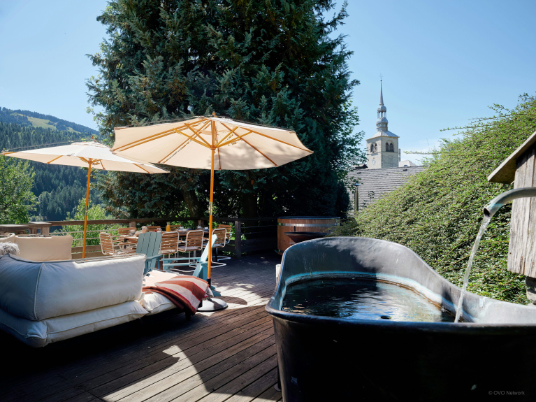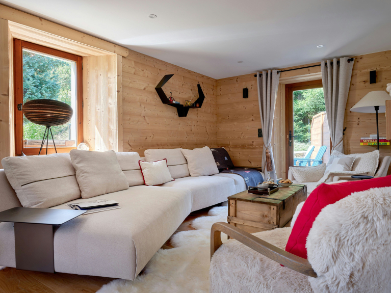 Die große, möblierte Terrasse verkörpert die Lebenskunst in der Höhe, mit einem Sofa, Liegestühlen und einem Esstisch, von dem aus man ein herrliches Panorama auf die Berge des Val d'Arly genießt. Ein diskretes nordisches Bad bietet eine wahre Wellness-Blase, und ein kleiner Garten am Hang vervollständigt den Außenbereich.