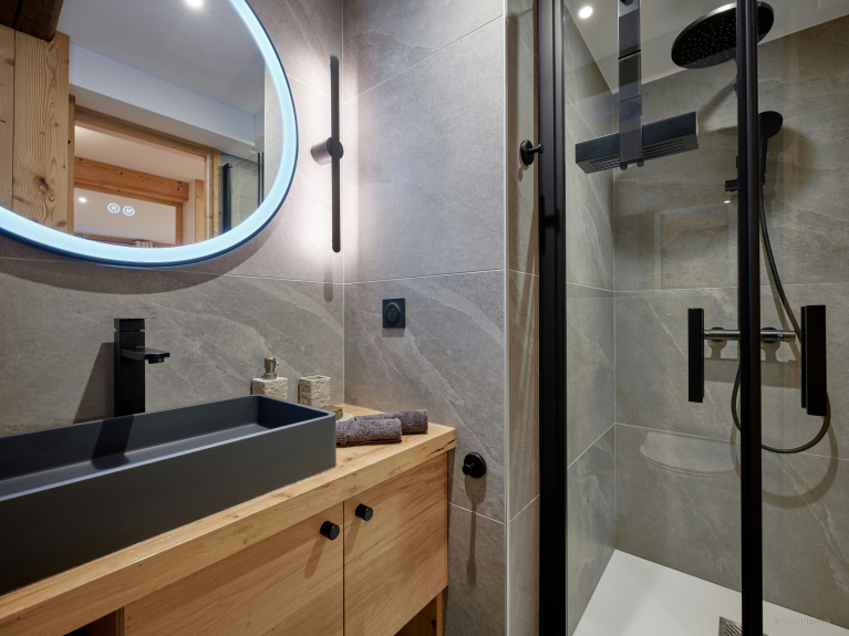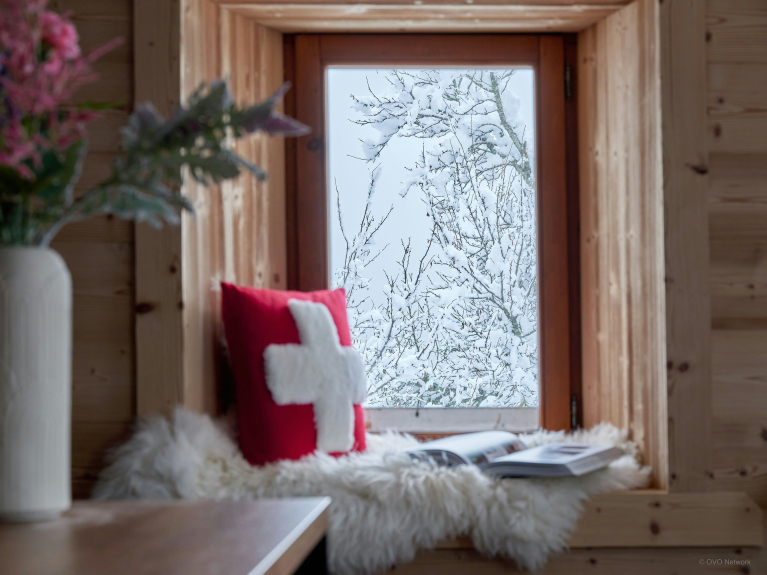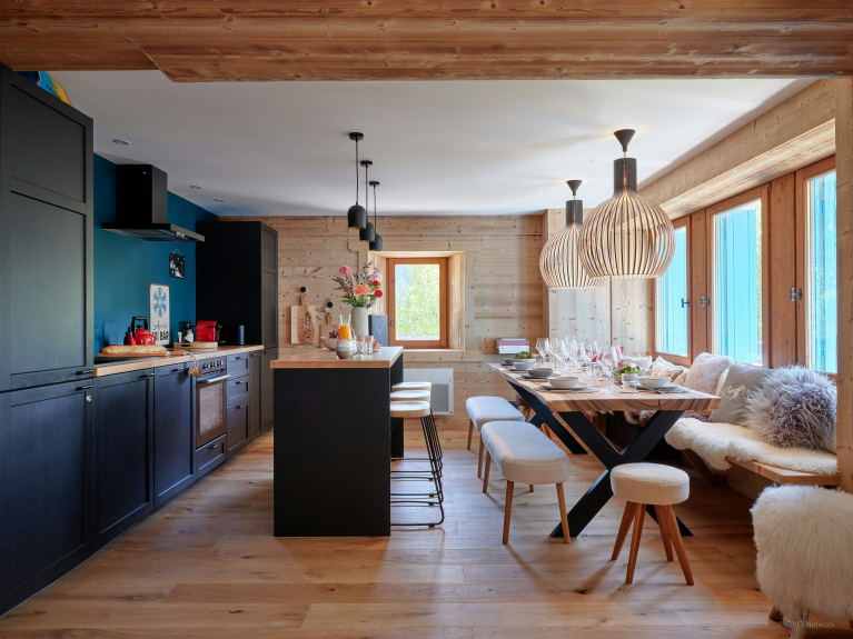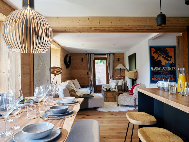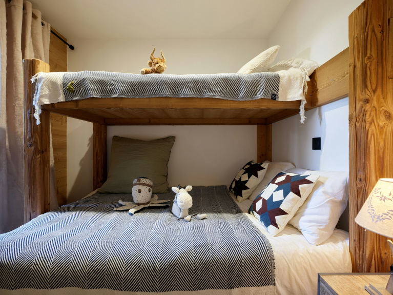 Drei Schlafzimmer und zwei Bäder bilden das Chalet Belle Source A, eine elegante, einstöckige Wohnung für acht Urlauber, in der jedes Detail durchdacht wurde, um Komfort und alpine Authentizität zu vereinen.