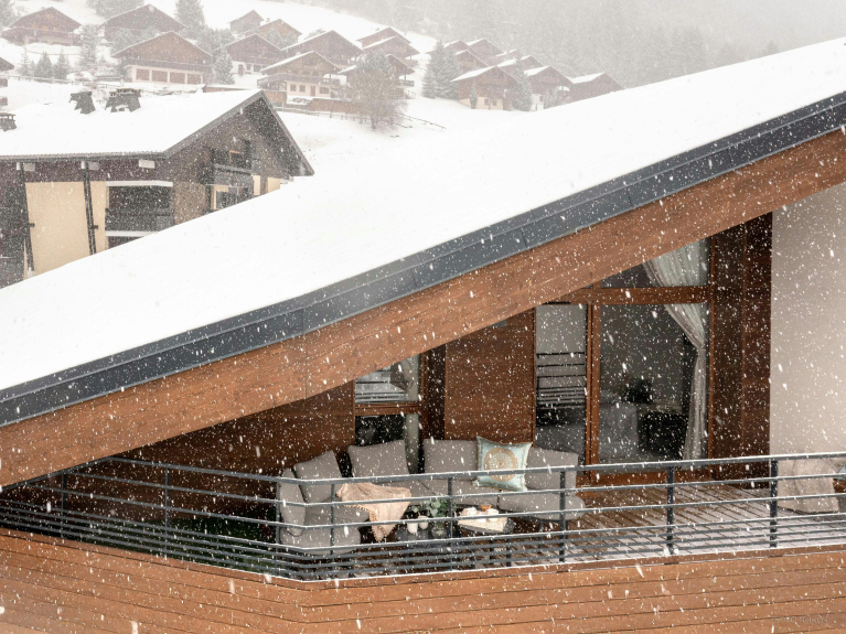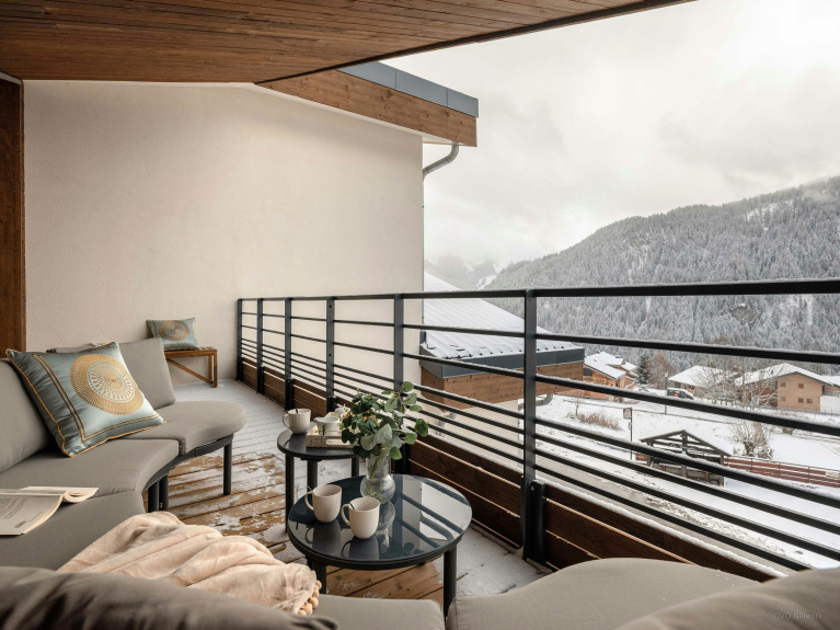 Ein Balkon mit einem Sofa bietet einen privilegierten Aussichtspunkt auf die Berge und das Tal, und in einem Spielzimmer mit Sofa und Fernseher können sich die Kinder ungestört vergnügen.