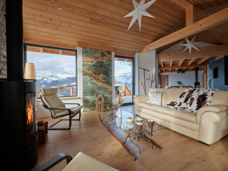 Das dank der großen Fenster lichtdurchflutete Wohnzimmer dient als Treffpunkt rund um einen Holzofen, während sich die ausgestattete Küche fließend in den Raum einfügt. Eine zweite Sitzecke ermöglicht es, die Landschaft in vollen Zügen zu genießen.
