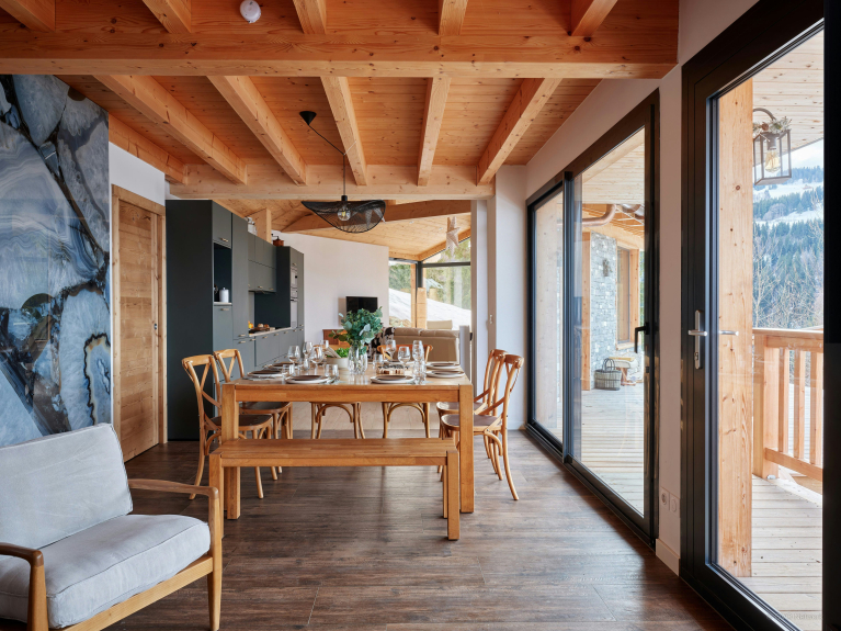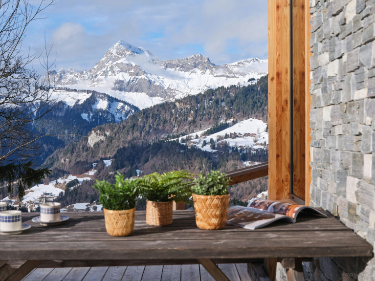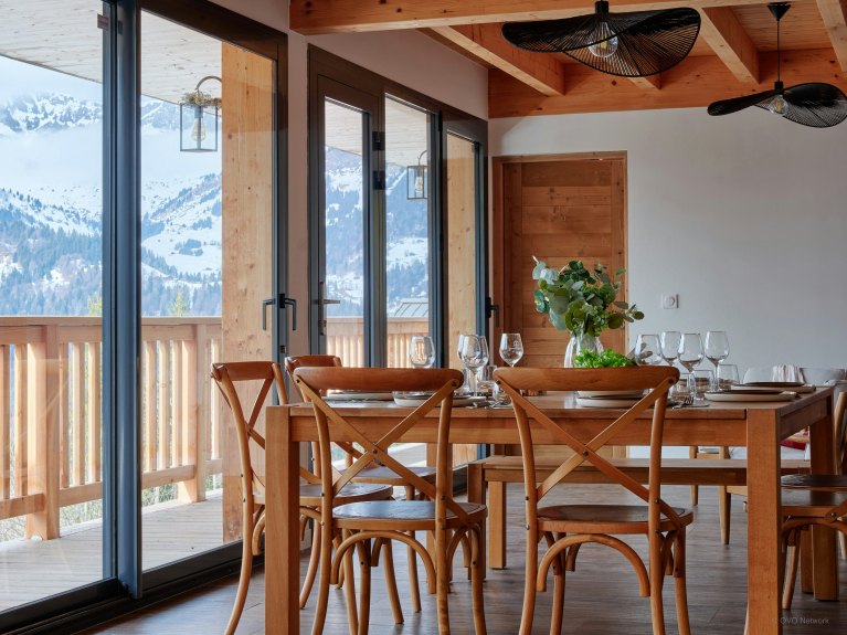 Das Chalet Panorea besticht durch den freien Horizont, den seine zahlreichen Öffnungen und die allgegenwärtige Aussicht auf die Berge von Aravis bieten. Es bietet mit vier Schlafzimmern und zwei Badezimmern Platz für acht Urlauber.