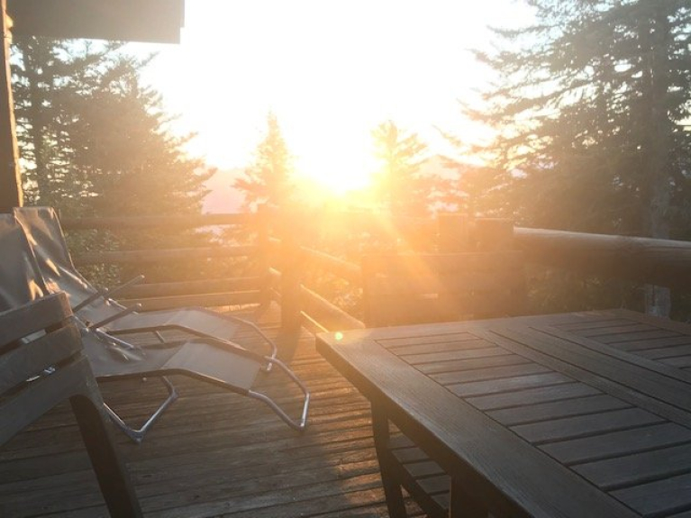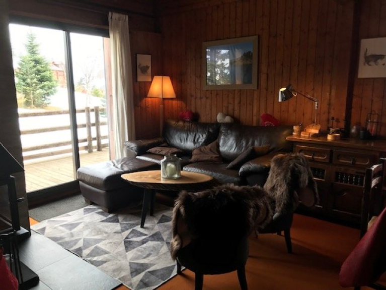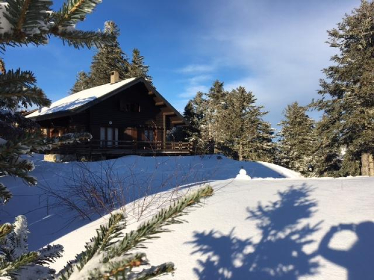 Facing south, the terrace offers a 180° view on the forest and the mountains, dominating a 300 m2 land belonging to the chalet.