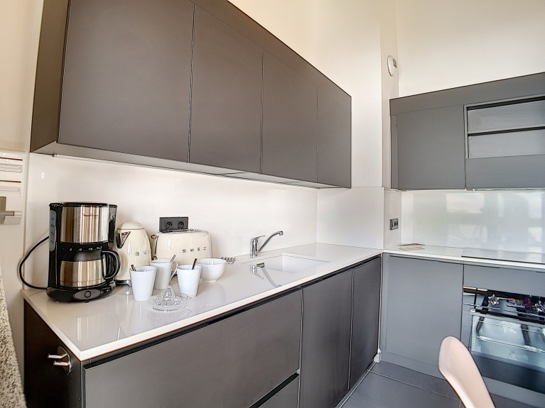 Open kitchen on the living room with induction plate, oven, fridge with deep frost freezer, dishwasher, electric kettle, toaster and coffee pot.
