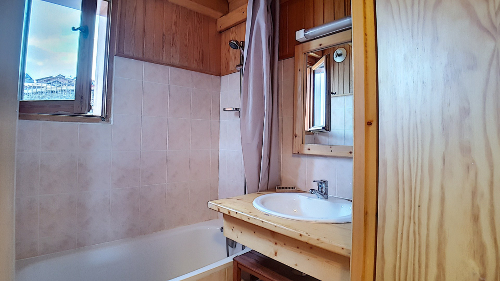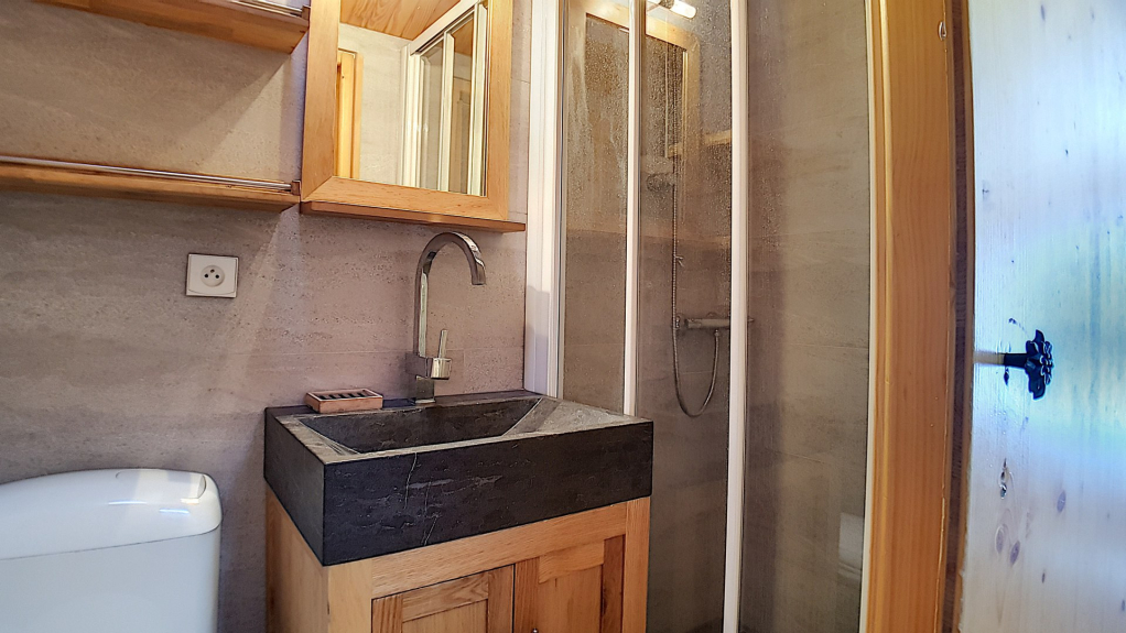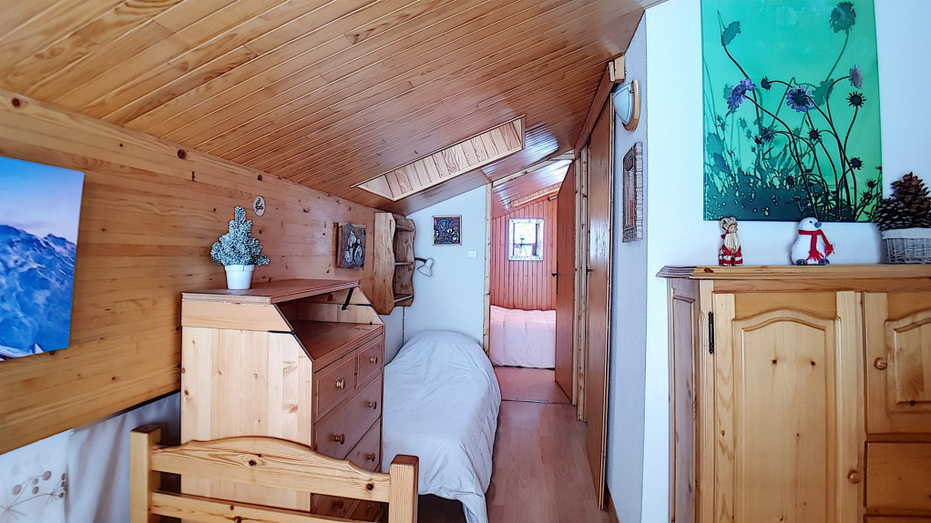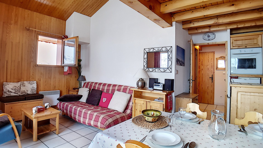 It is located on the 3rd and 4th floors on the slopes side, with a large balcony-terrace of 15m² facing South and a very nice panoramic view at 270° on the Cime Caron, the Masse and the slopes.