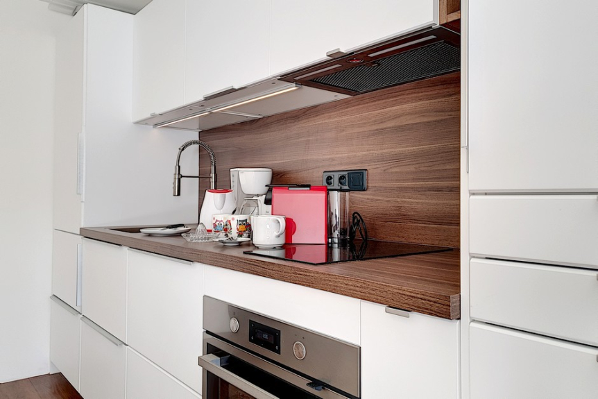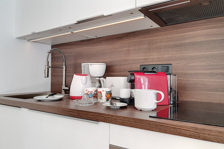 Separate kitchen with induction cooker, refrigerator, oven, microwave, dishwasher, kettle, toaster and coffee maker.