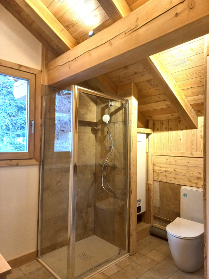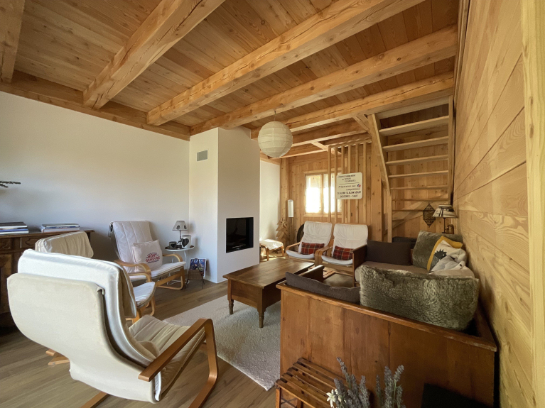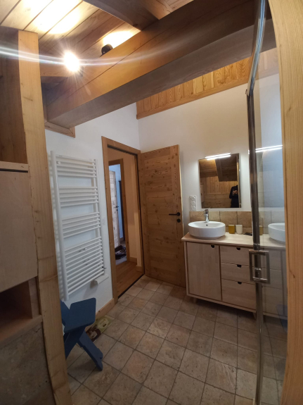 The chalet comprises a large living room with fireplace opening onto the terrace, and a spacious dining room for a nice table on the way back from the slopes over a hot chocolate or raclette. The chalet includes 3 double bedrooms + 2 mezzanine beds (2 single beds) with closets and storage space, 3 bathrooms (1 with WC) + 2 separate WCs, a fully-equipped kitchen (with dishwasher, electric oven, induction hob, large fridge, microwave, Nespresso machine, kettle), washing machine and dryer, separate freezer, satellite TV corner, Wifi, DVD and Blu-Ray player. Spacious ski and boot room. The chalet has a south-facing balcony on 800m² of land, including a 20m² west-facing terrace.