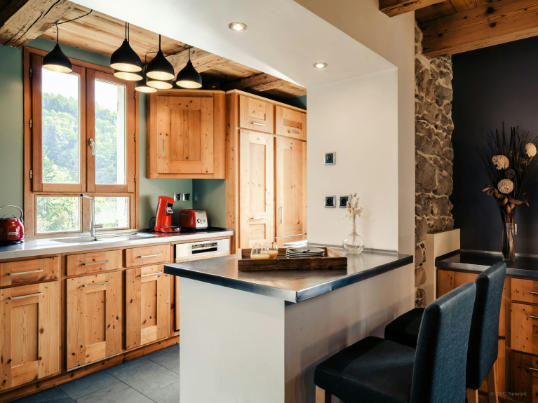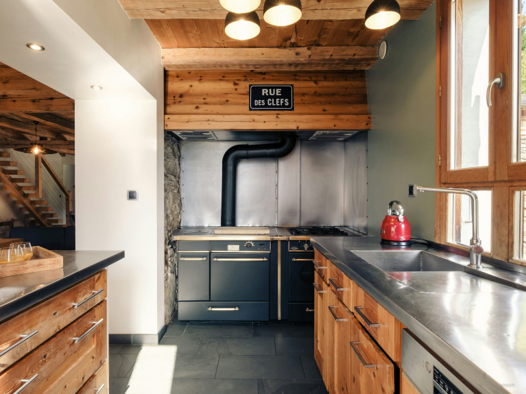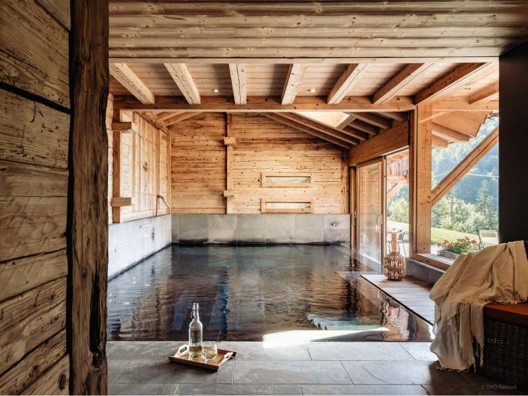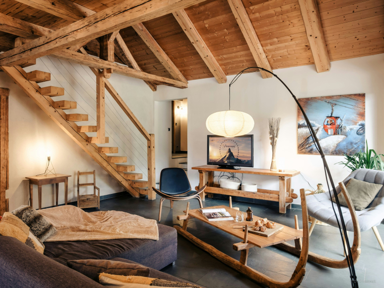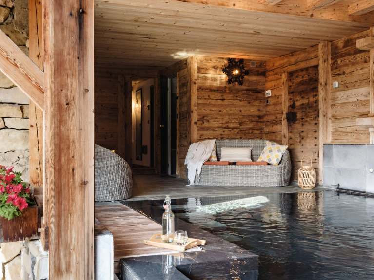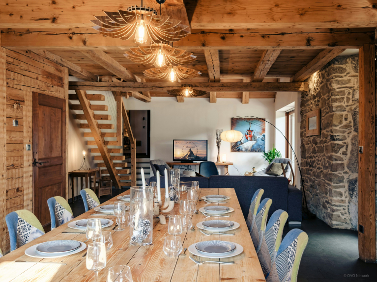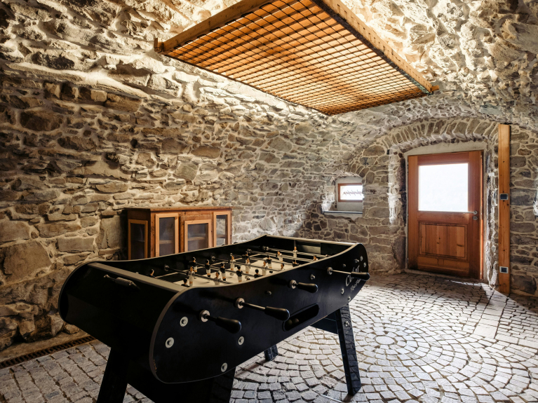 The outdoor space is one of the highlights of the property, with a large sunny terrace perfect for relaxing, the covered part of which houses a dining area for 12 people, usable all year round - the perfect place to enjoy a terrace dinner while watching the sun set behind the mountains. The old cheese cellar below the chalet has been converted into a ski room, where you can store all your equipment.