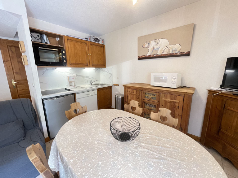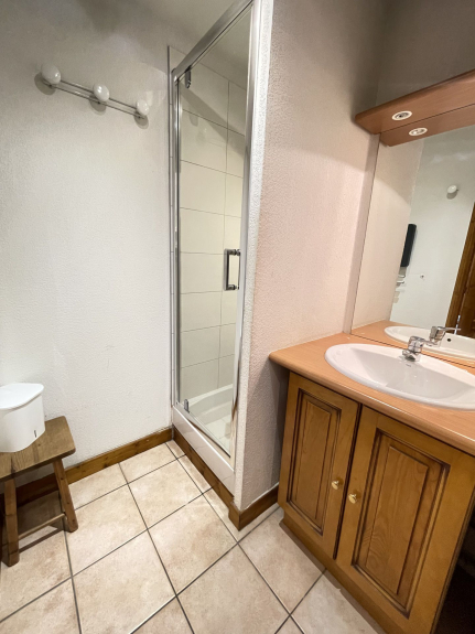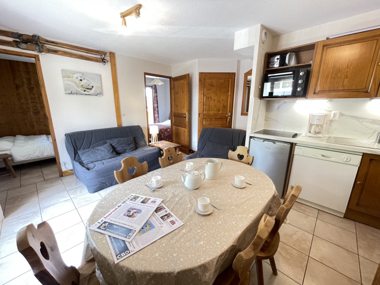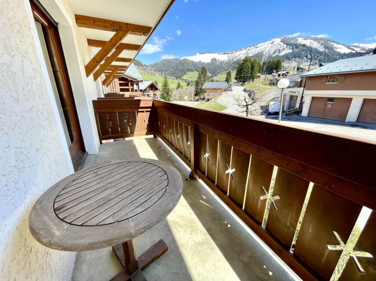 Apartment AUGIER. Les OURSONS A. 3 rooms, 6 persons, 40 sqm, 1st floor, 2 balconies: 1 SOUTH exposure with view on the slopes + 1 WEST exposure with view on the Mont Charvin and the valley.