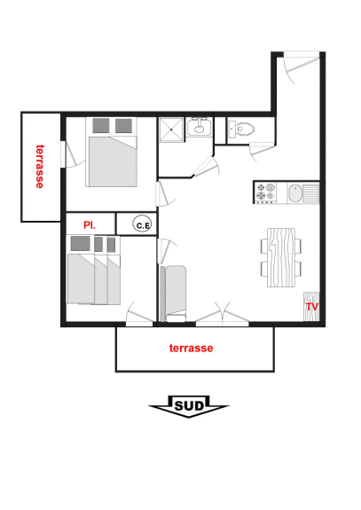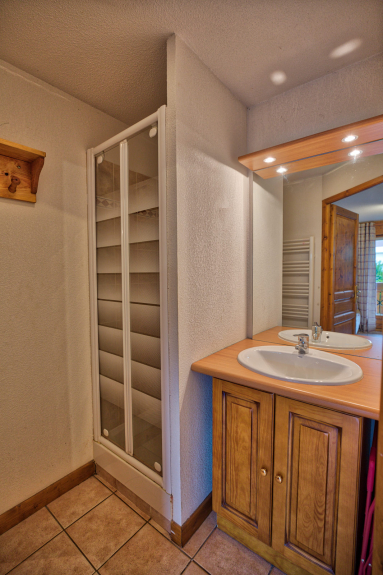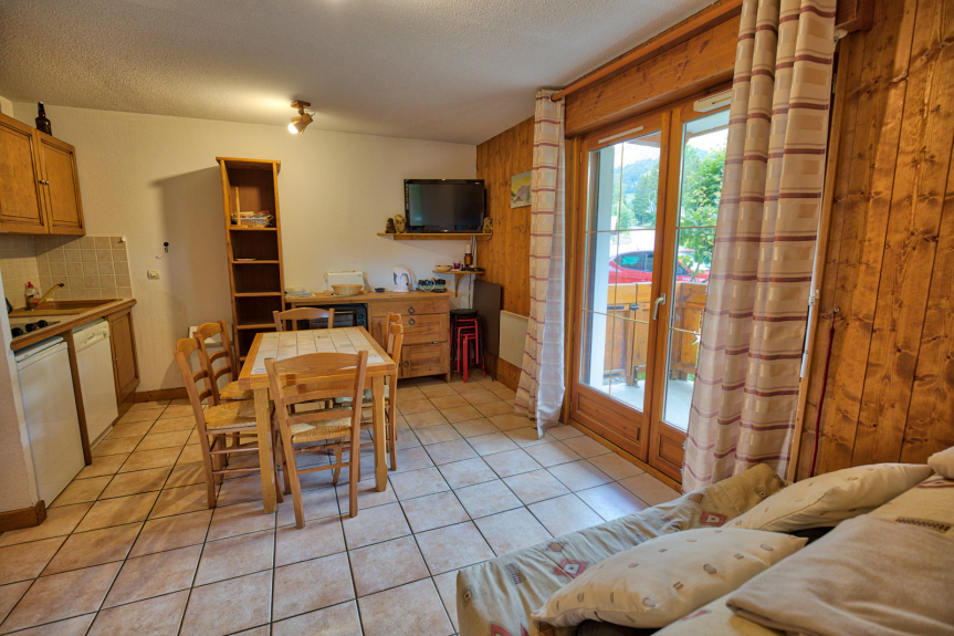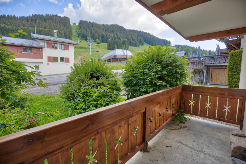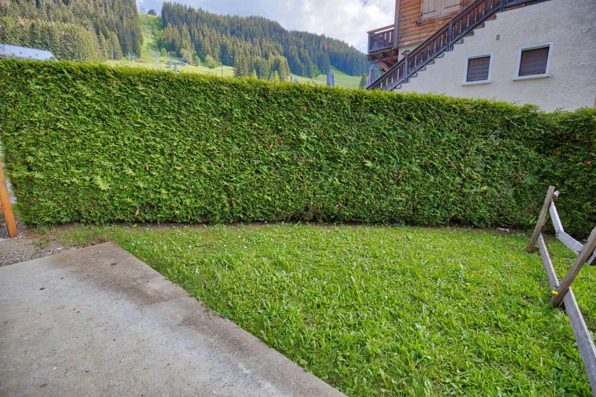 Warm apartment of 38m² on the ground floor with 2 private terraces : one facing SOUTH with a view on the slopes and one facing WEST with a view on the Mont Charvin and the valley.