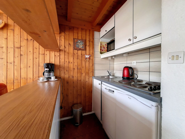 Built-in kitchen with 4 hotplates, mini oven, refrigerator and dishwasher, toaster, kettle and coffee maker