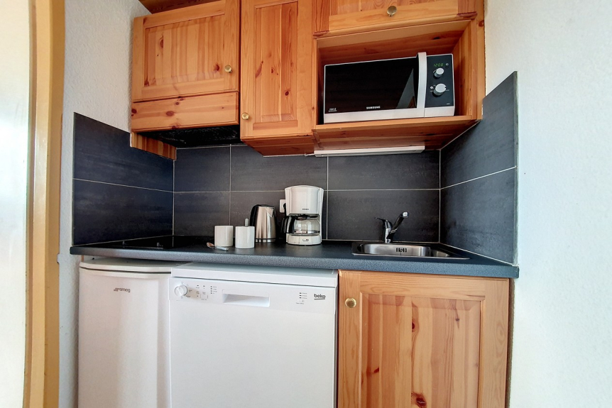 Built-in kitchen with 2 hotplates, microwave, refrigerator, dishwasher, toaster, kettle and coffee maker.