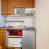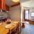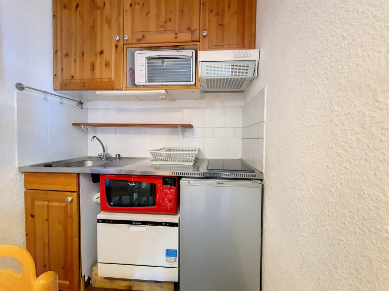 Built-in kitchen with 2 hotplates, oven, refrigerator, dishwasher and microwave oven, toaster, coffee maker and kettle.