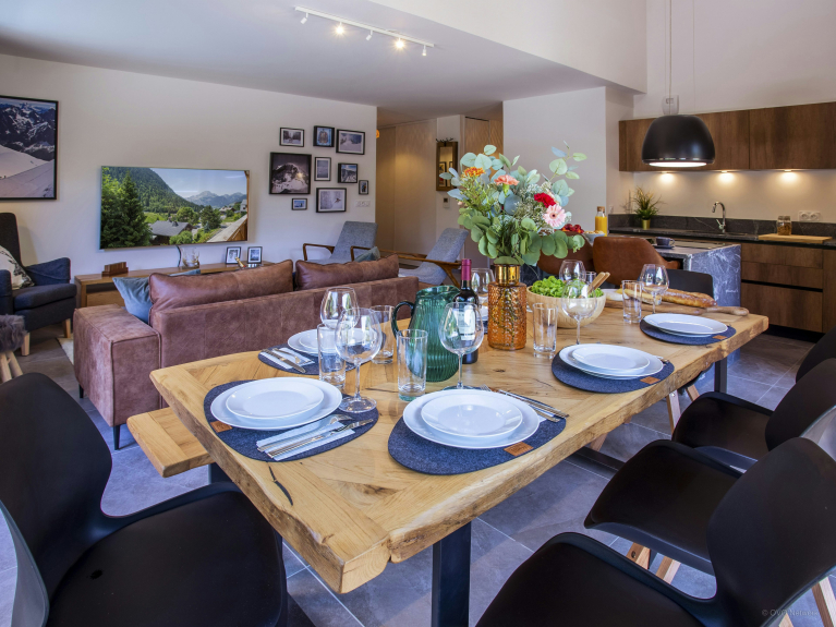 Because it is located on the third floor of a building, in a quiet corner of the Abondance valley, its terrace offers splendid views of the forest and the surrounding mountains.