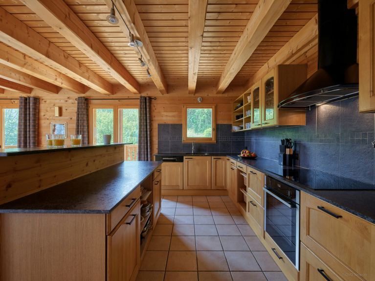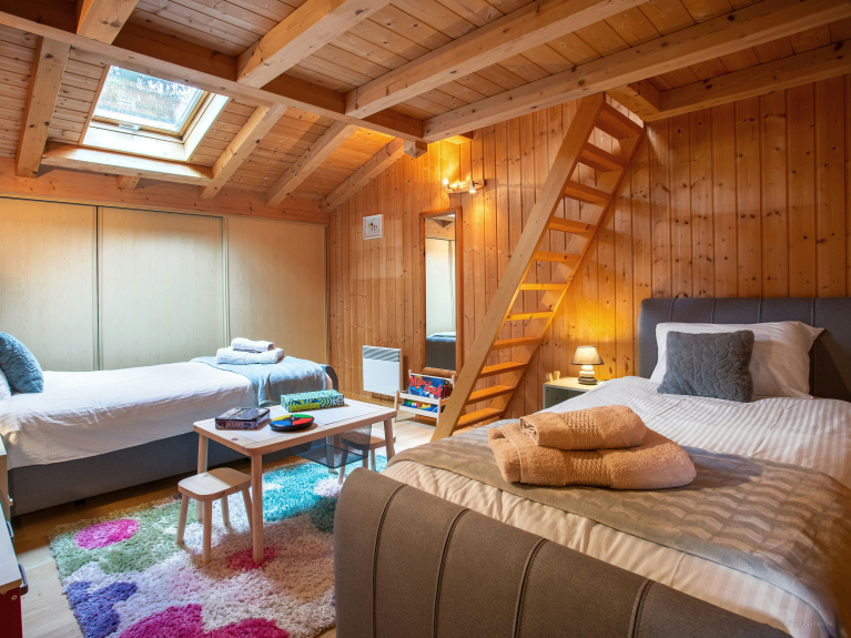 We particularly like the communal areas of the Isla de Lux chalet: the cosy main living room, with its TV and fireplace; the games room, with pool table, sofa and kitchenette, where older children can meet up in the evenings; and the mezzanine, with sofa and desk, for those who want to work remotely. The kitchen is well-equipped, and the central island allows several people to cook together.