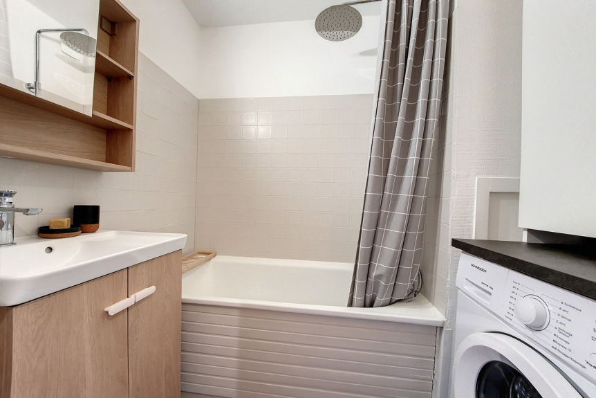 Bathroom with bath and washing machine.
